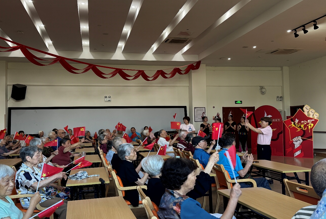 演出在全体合唱《唱支山歌给党听》中达到高潮。当熟悉的旋律响起,长者们自发挥舞着手中的国旗,现场顿时化作一片红色的海洋。演出结束后,意犹未尽的长者们与同学们又共同唱响了《歌唱祖国》。歌声响起时,满头银发的爷爷奶奶们不约而同地挺直了腰板,眼中泛着泪光,歌声愈发洪亮。退伍军人爷爷颤抖着双手紧握小国旗,仿佛回到了激情燃烧的青春岁月。