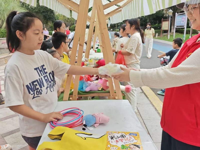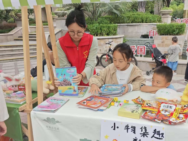 当天下午,志愿者抵达现场:划线分区、张贴价签、帮“小掌柜”把旧书、玩具、手工艺品分类上架。面对初次“练摊”的小朋友,他们蹲下身轻声指导。一声声鼓励让孩子们鼓起勇气,童声吆喝很快此起彼伏。志愿者同时维持秩序、疏导人流,并设立“以物易物”专区,引导居民用闲置水杯换走一本绘本、用旧篮球换来一盆绿植,让“绿色循环”理念在欢笑中自然传递。
