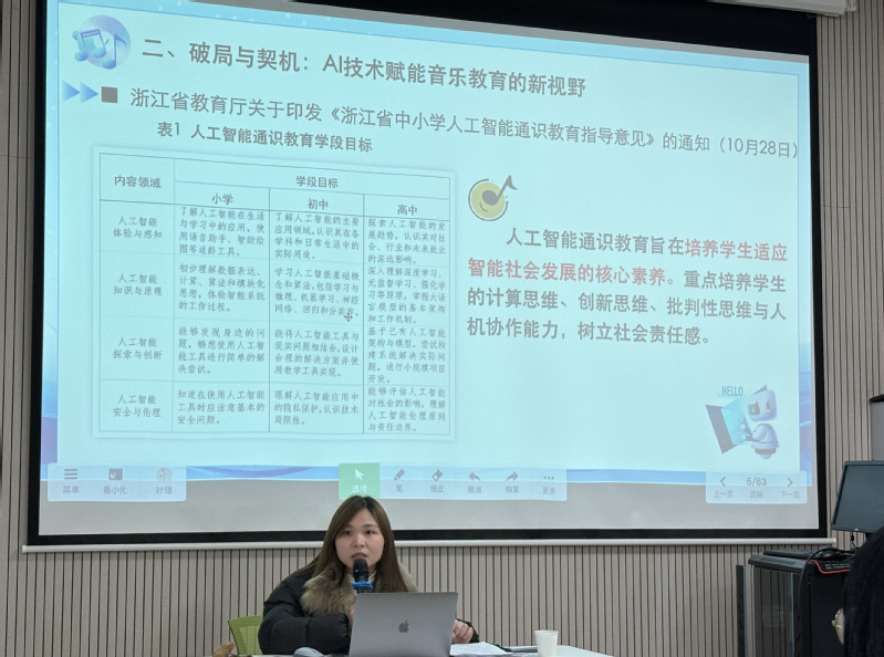 为提升音乐学(师范)专业毕业生的数字素养,把握教育前沿动态,音乐学院近日特邀丽水经济开发区第一小学高级教师叶璟,举办《AI赋能,因材施乐——人工智能个性化音乐教学新图景》专题讲座,为即将走上教学岗位的准教师们呈现了一场融合政策解读、技术创新与实践应用的学术盛宴。