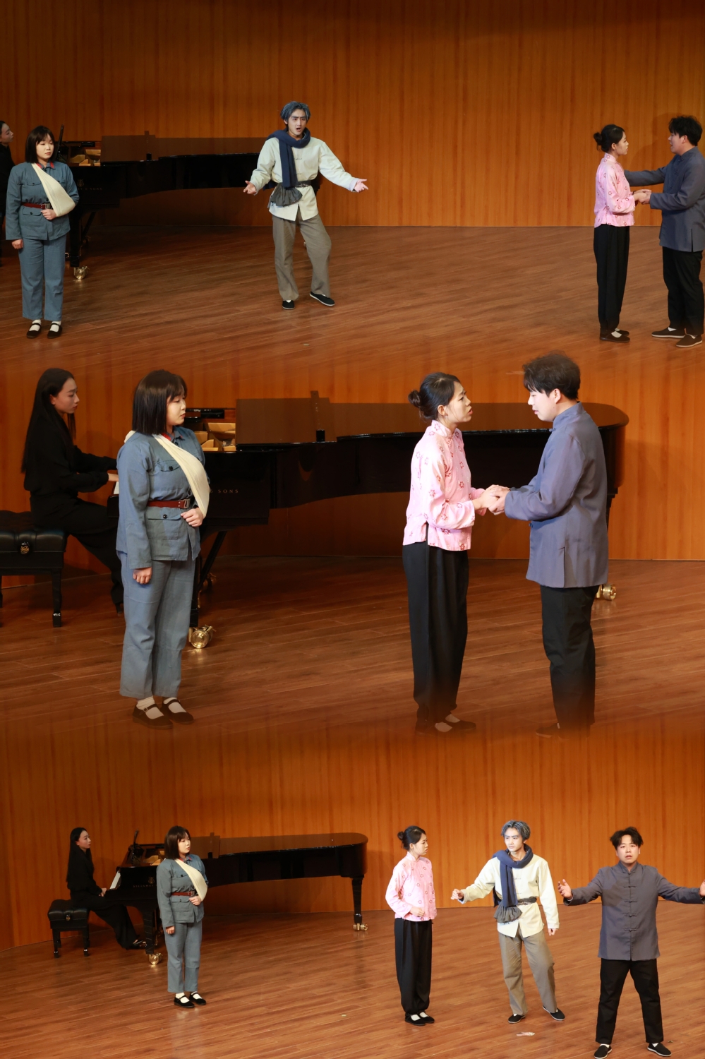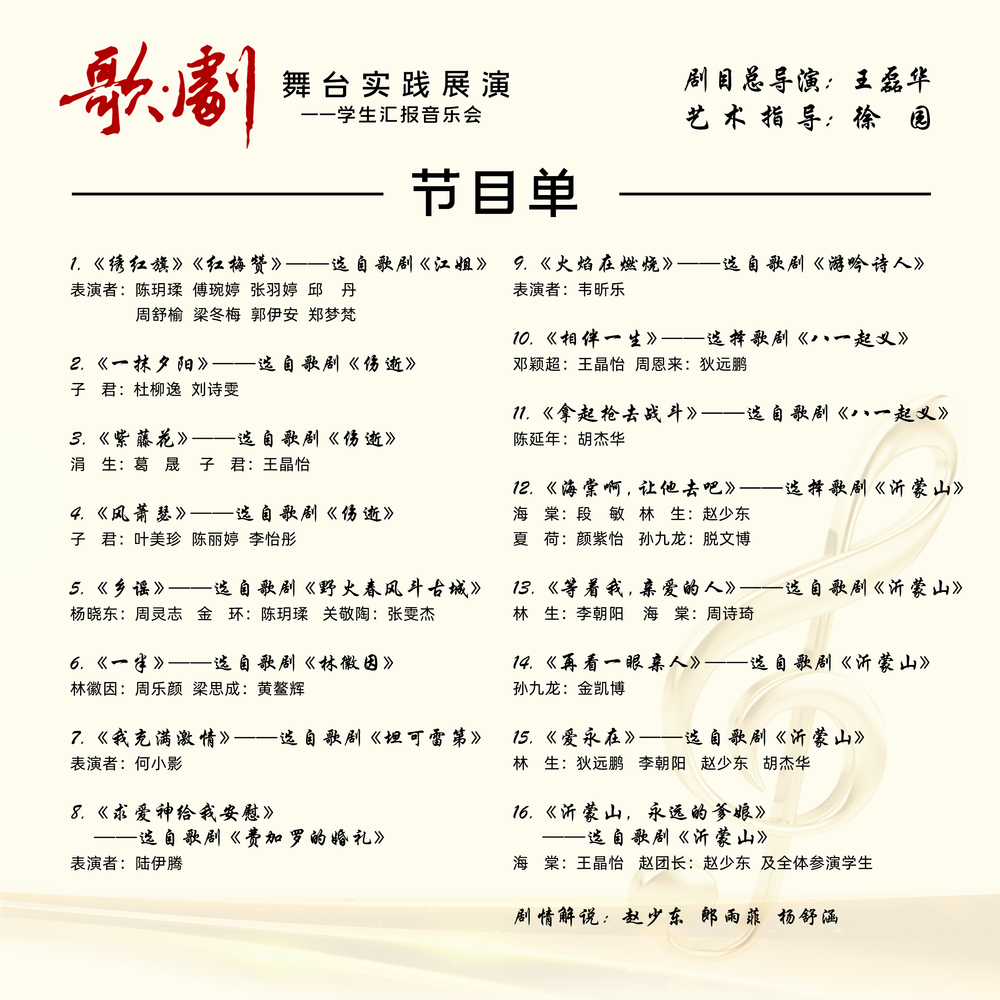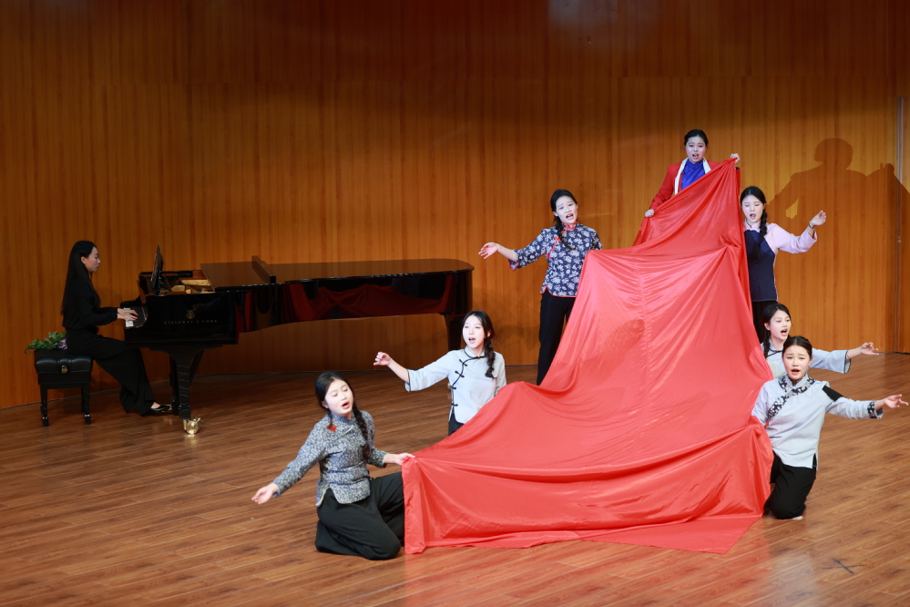 本次展演汇聚了音乐学院从大一本科生到研究生阶段的专业尖子生。在不足一个月的紧张筹备期内,同学们齐心协力完成了组队选剧、分组筹备、集中排练到登台演出的全流程工作。从《绣红旗》《红梅赞》(选自《江姐》)里红岩英烈的赤诚信仰,到《八一起义》选段《相伴一生》《拿起枪去战斗》中革命先辈的热血担当,再到《沂蒙山》系列唱段里军民相依的家国深情……16个歌剧片段以艺术叙事串联起信仰、青春与家国的精神脉络,既是对红色经典的致敬,更是“美育载思政、艺术润人心”教育理念的具象表达。