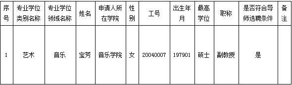 根据《丽水学院硕士研究生指导教师遴选办法》丽学院办〔2025〕51号文件精神,经音乐学院综合办公室对宝芳同志的申请材料进行资格审查,目前已完成学院层面的审核,现将宝芳同志的审核情况予以公示(申请材料见附件):