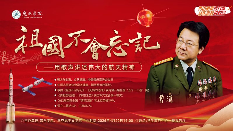 4月22日下午,由丽水学院音乐学院、马克思主义学院联合主办的秀山丽水活力城 音乐思政进校园主题活动,在学生事务中心报告厅顺利举行。著名军旅作曲家、文艺导演曹进大校应邀主讲《祖国不会忘记——用歌声讲述伟大的航天精神》专题讲座。音乐学院学术院长王磊华教授、马克思主义学院院长龚志伟教授及师生代表到场参加。